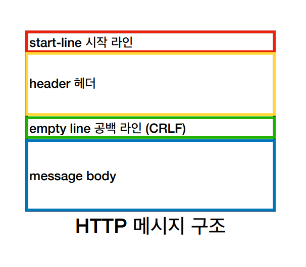 - 시작 라인: HTTP 버전(HTTP/1.1), HTTP 상태 코드(200-성공, 400-클라이언트 요청 오류, 500-서버내부오류), 이유 문구(OK, BAD REQUEST)